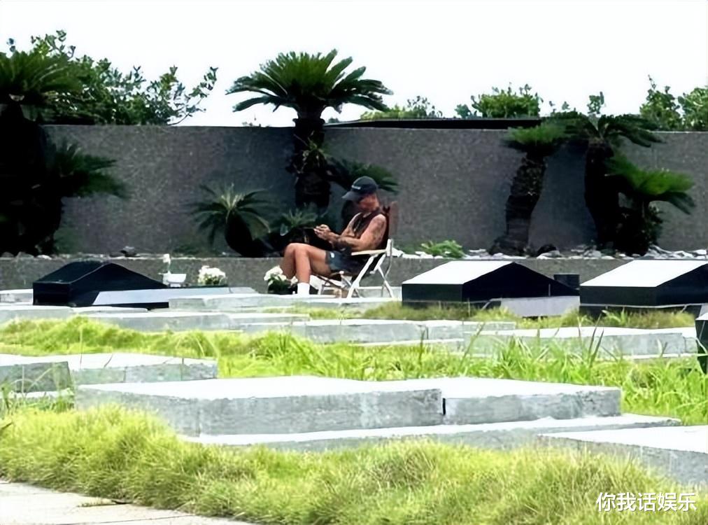 具俊晔在大S墓前,放有一把椅子,一把伞,还有一个平板电脑。