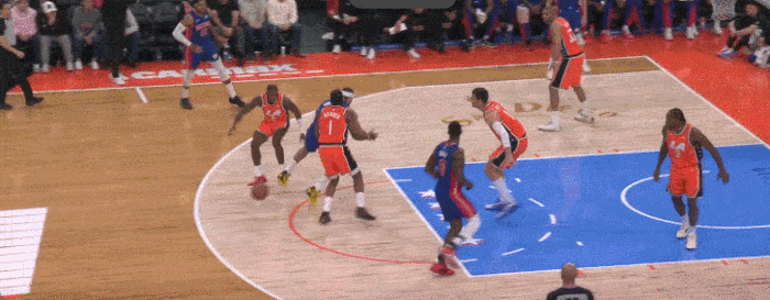 挤过掩护 面对爱德华兹 虽然被投篮假动作点起 但是最后依旧能干扰到投篮