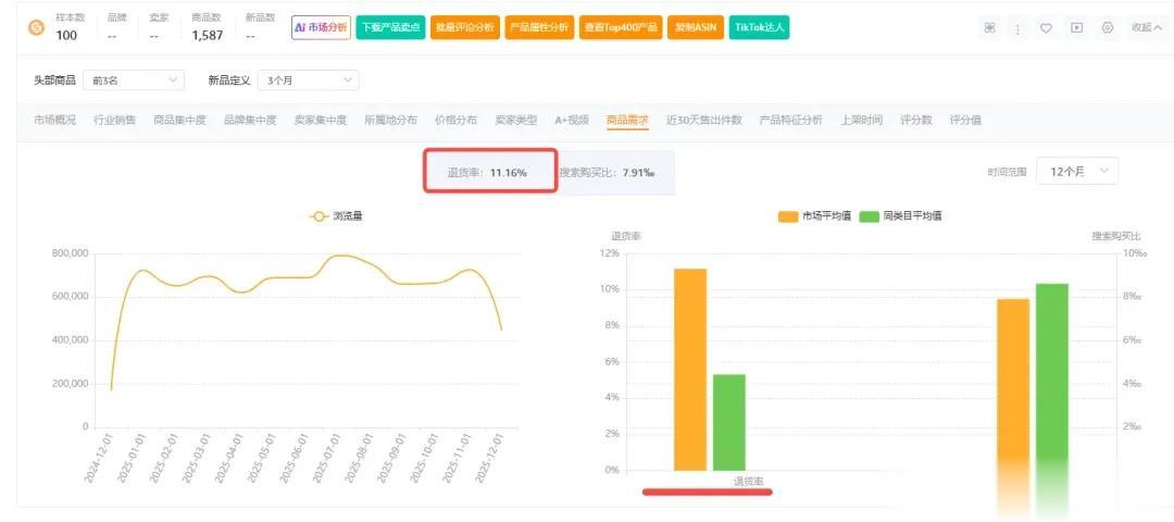 用卖家精灵工具可以看到最近30天,整个小类的退货率情况: