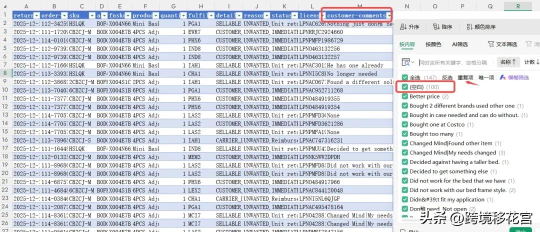 很多卖家家都会看M列的 “customer comment"再去找到细分原因看原因占比情况。