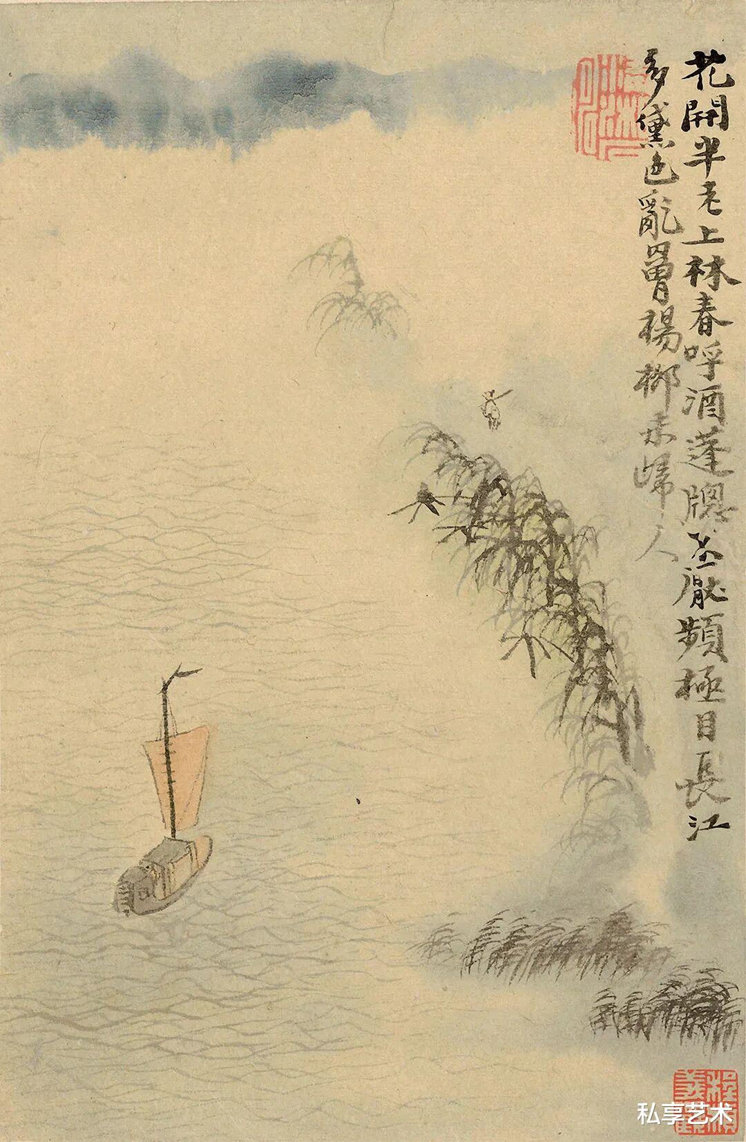 这套《江行册页》,是石涛五十一岁自北京沿运河南下归扬州途中所作。此时的他,半世云游,历经家国巨变与红尘起伏。在相关研究看来,石涛笔下的舟,并非简单的写实,而是一种生命姿态的象征——“天地能涵狂放客,轻舟移过万峰时”。在这组册页中,他将心灵的活动场所搬到了水上舟中,仿若唐代的张志和,不在得鱼,而乐在烟波。