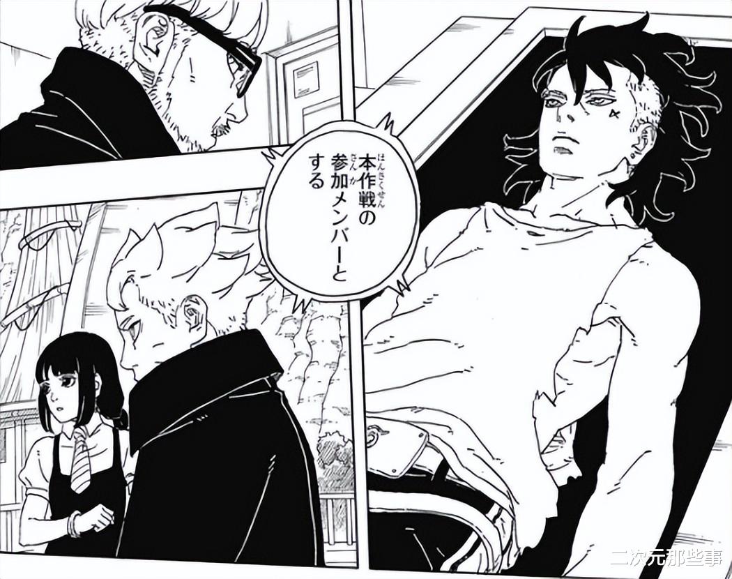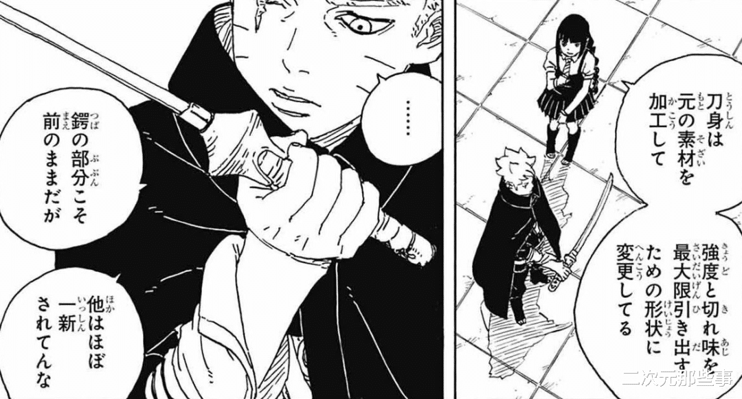 另一边,木叶村中,大名特使已经审完了木叶丸,随后他又叫来了巳月,准备把巳月也审问了,因为之前巳月和博人也有接触。与此同时, 班长笕堇把修复好的草薙剑还给了博人,此时的草薙剑不但被升级成了新的材质,而且还内置了科学忍具,可以配合博人的宇智波剑术一起使用,笕堇还提到这把全新草薙剑还合成了一种特殊的素材。