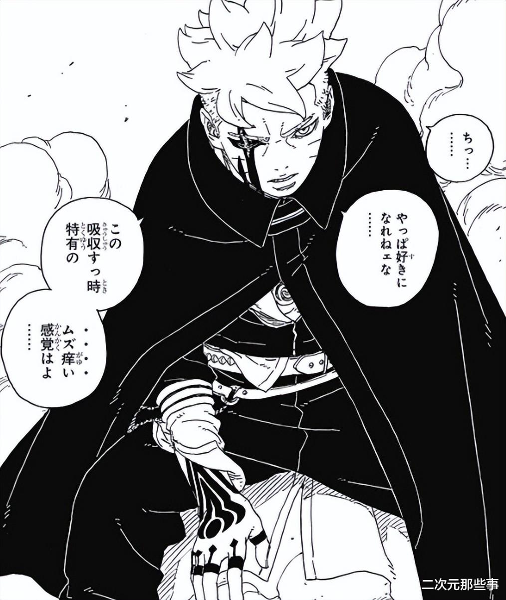 紧接着,“虫”的两个分身开始对着博人释放火遁,准备烧死博人。关键时候,博人使用了手里的“楔”,把火遁都吸了进去,吸完后,博人一边站起来,一边吐槽说用楔吸收忍术的感觉很不好,又恶心又痒,然后用凌厉的眼神盯着眼前的“虫”,大战一触即发。