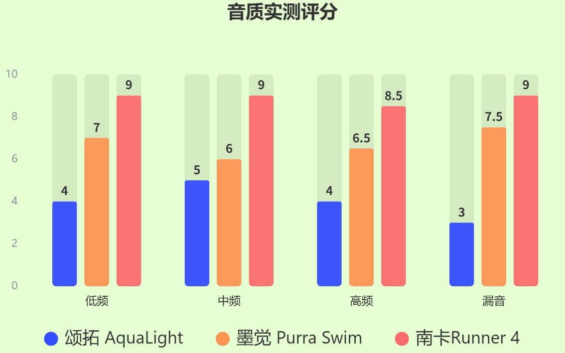南卡 Runner 4 的音质和漏音控制最出色,声学配置的优势都落到了实际体验中,全场景表现在线;墨觉 Purra Swim 能应付运动时的基础听音需求,但中高频表现和漏音控制还有提升空间;颂拓 AquaLight 音质平淡,抗风噪和漏音控制都存在明显短板,只能在低要求的运动场景使用。