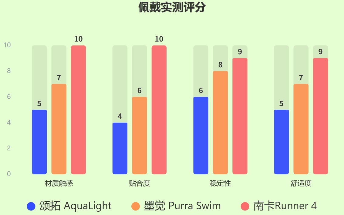 南卡 Runner 4 的佩戴舒适度断层领先,26g 轻量化设计 + 柔韧钛丝 + 亲肤硅胶,再加上针对眼镜用户的优化,不管是长时间静态佩戴还是高强度动态运动,都能保持舒服的体验;墨觉 Purra Swim 短时间运动戴还行,但透气性和眼镜兼容度不够;颂拓 AquaLight 虽然运动时稳固,但材质偏硬,长时间佩戴容易疲劳,日常通勤使用不太友好。