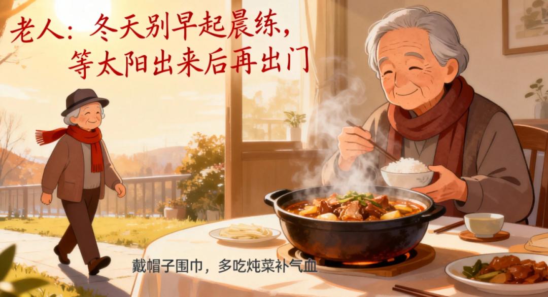 冬天别早起晨练,等太阳出来后再出门;出门戴帽子、围巾,保护好头部和颈部;多吃点炖菜,比如萝卜炖羊肉,软烂好消化,还能补气血。
