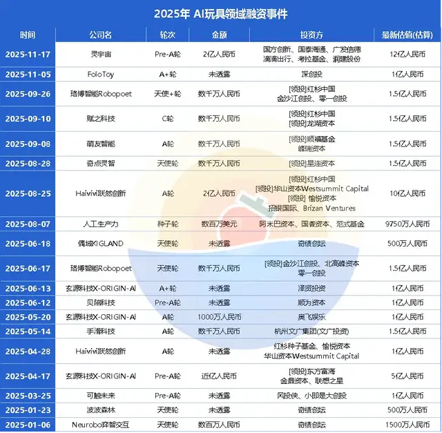 今年AI 玩具赛道拿融资的起步规模,差不多是在千万元级别。且这些公司大多创立于2023年-2024 年期间,公司很新,但是已经有公司估值超过10亿元。