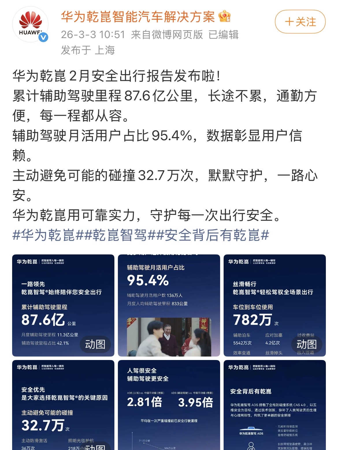 3月3日,华为智能汽车解决方案BU CEO靳玉志对外分享了《华为乾崑2月安全出行报告》。