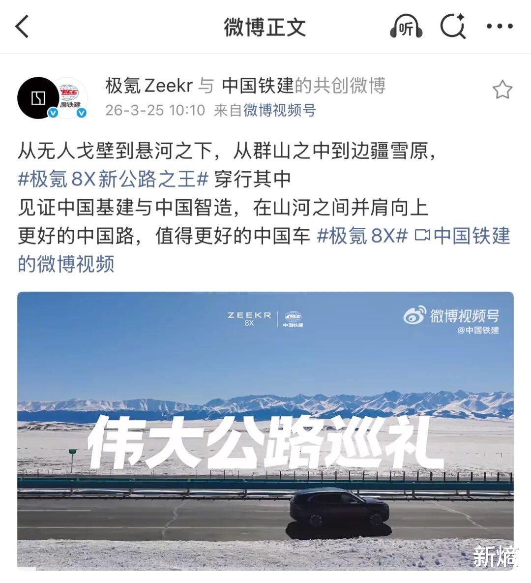 但这并非一场汽车圈的独角狂欢。3月25日,极氪8X携手中国铁建,共同呈现《伟大公路巡礼》主题大片,“更好的中国路,值得更好的中国车”获得了众多网友的点赞和认同。