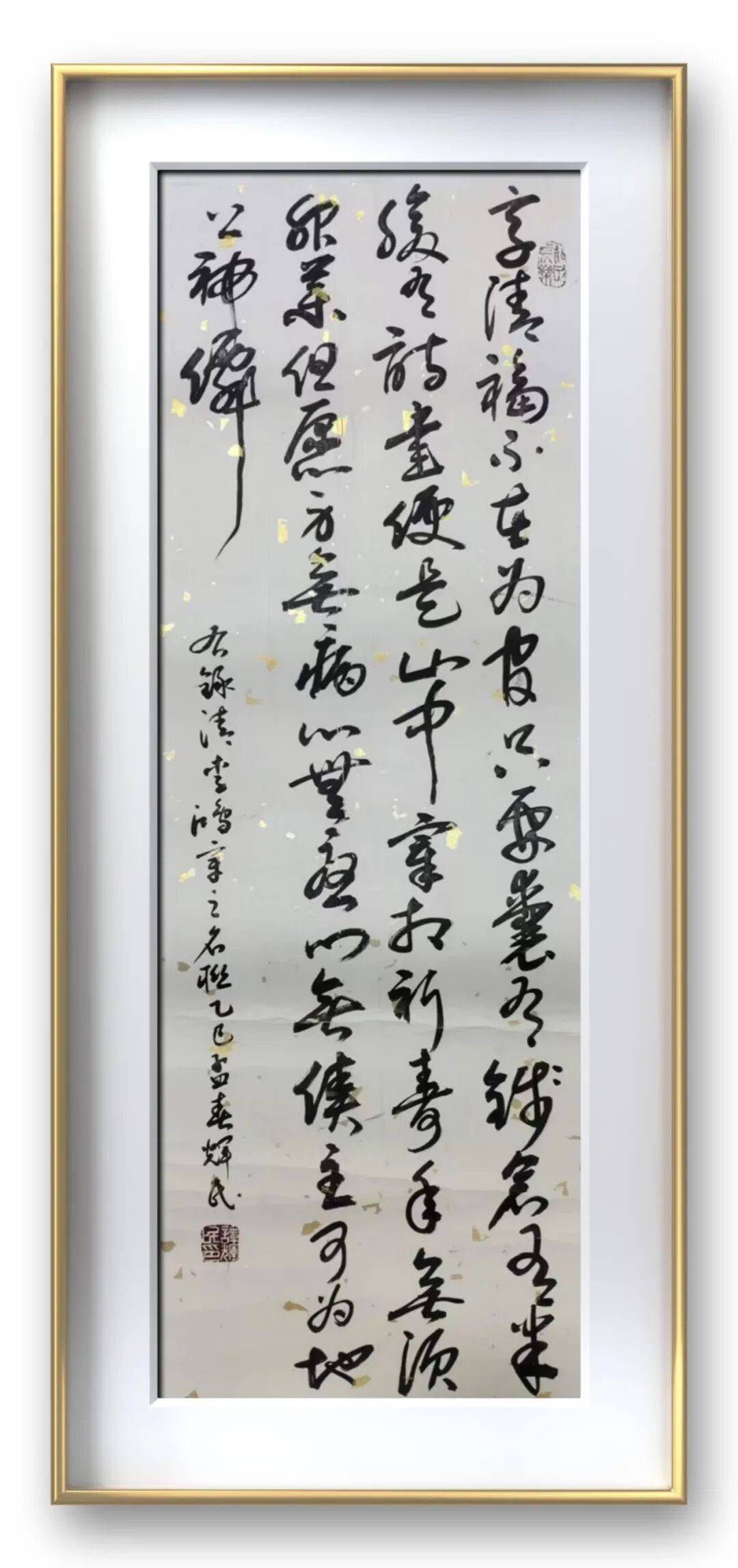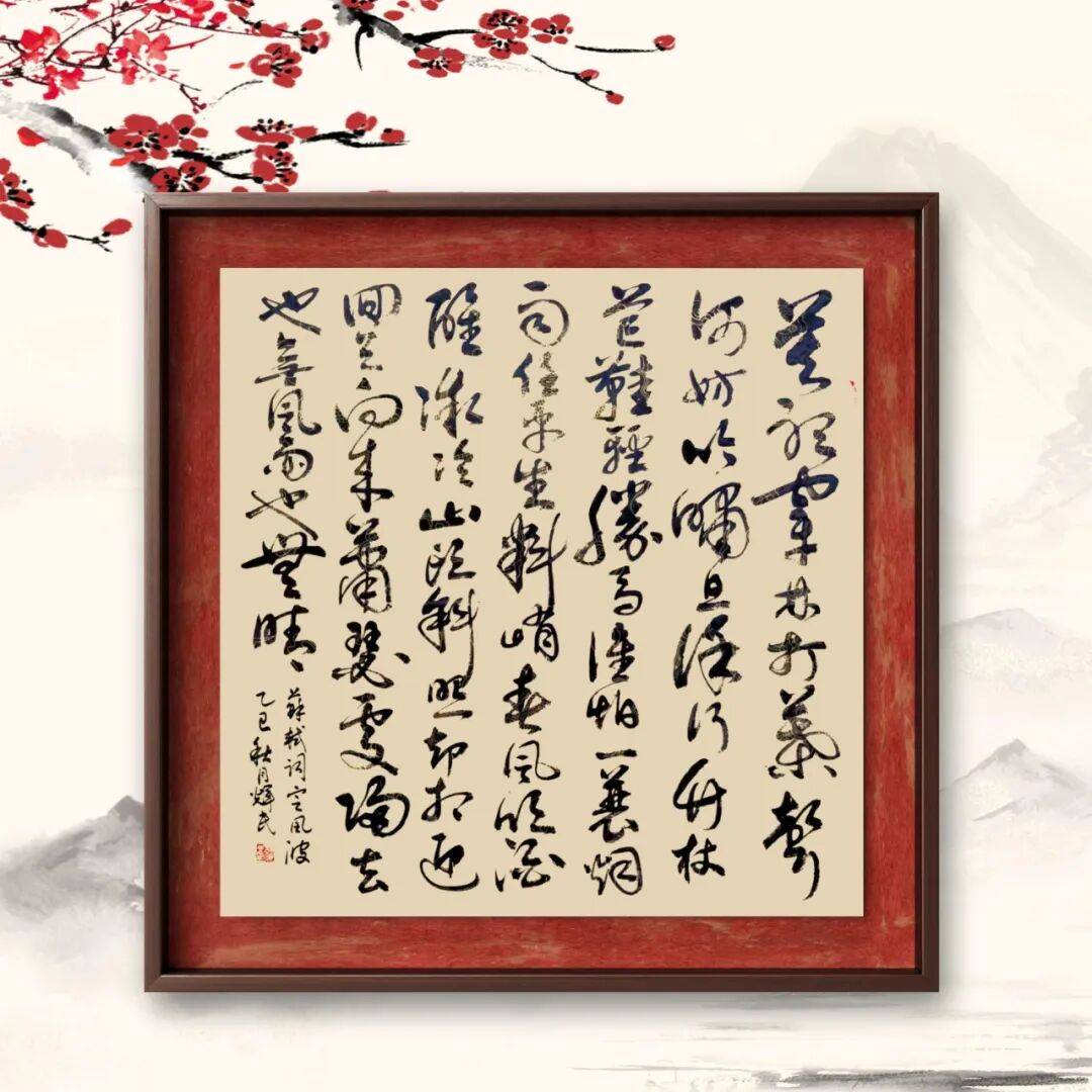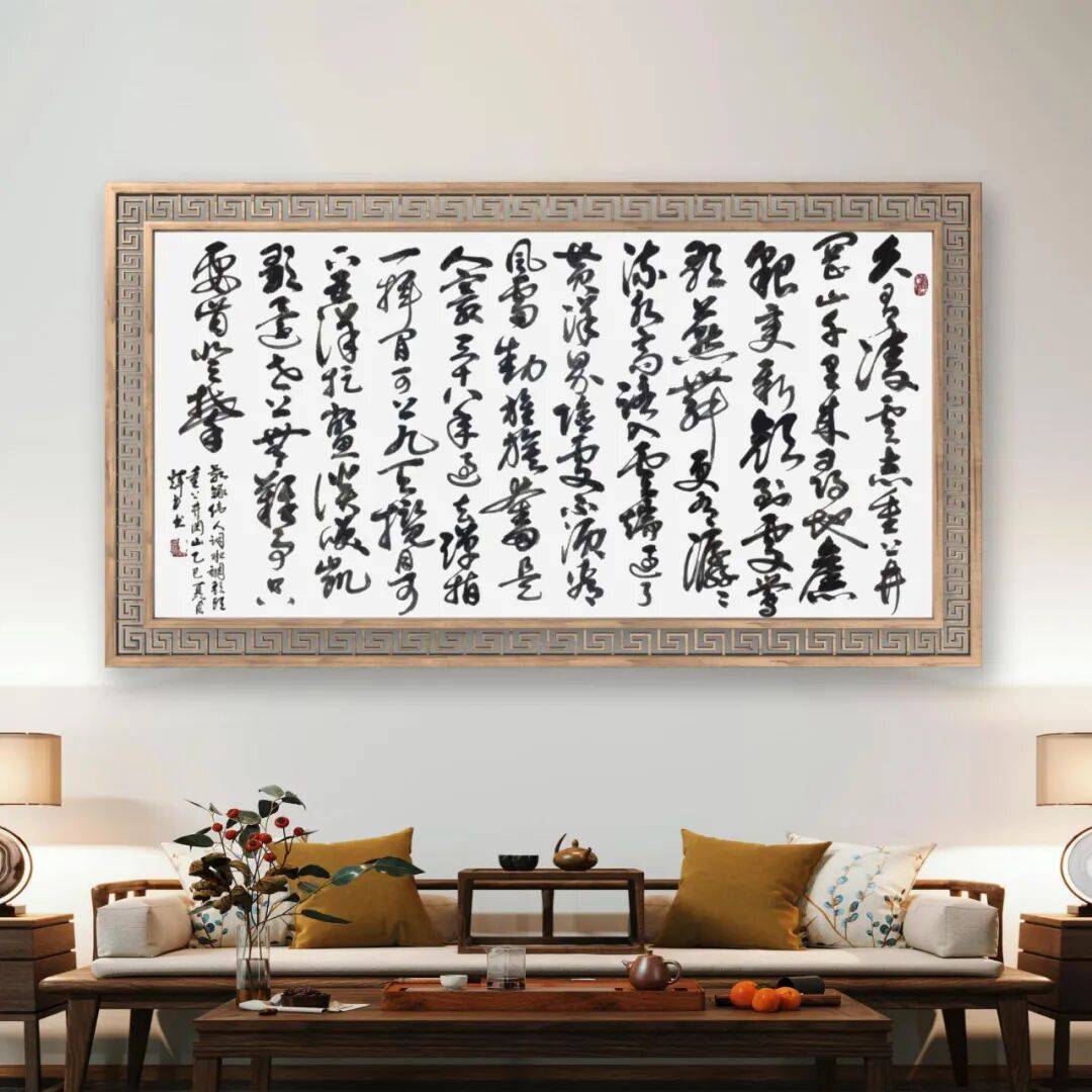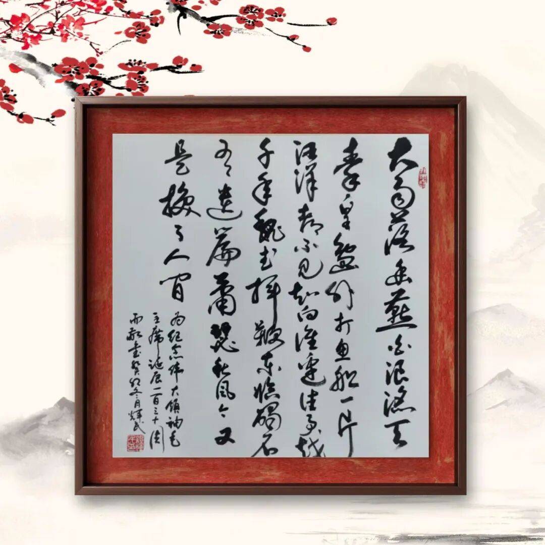而草书,则是谭辉民老师艺术个性的极致释放,尽显 “笔走龙蛇,气象万千” 之态。草书最能体现书写者的情感与个性,讲究 “破体出新,纵情挥洒”,但自由之下,仍需以法度为纲,否则便成 “野狐禅”。谭辉民老师的草书,无疑是 “放而不纵,狂而有度” 的典范。他的草书作品,线条奔放不羁,笔画简练传神,时而笔走龙蛇,一气呵成;时而戛然而止,留有余韵。字形虽简,却意蕴丰富,省去了不必要的修饰,只保留最核心的笔墨精神,于潦草中见风骨,于狂放中显理性。整幅作品布局疏密错落,墨色浓淡相间,枯湿互映,如疾风骤雨,气势磅礴,却又章法井然,让人感受到草书独有的豪放之美、写意之美。这份 “放得开,收得住” 的功力,正是他二十载兼修不辍的最好证明,彰显了其对书法艺术规律的深刻洞察与灵活运用。