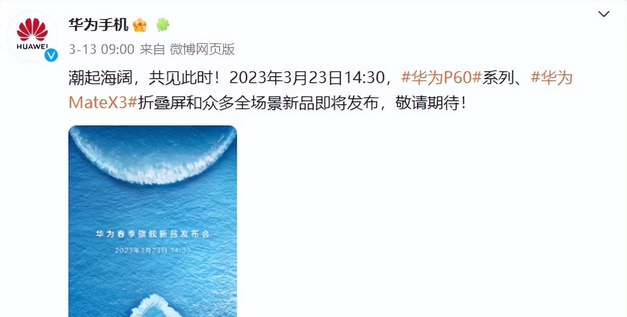 华为本周(3月23日)将会举行华为春季旗舰新品发布会,华为将会在春季旗舰新品发布会上推出华为P60系列手机,华为mateX3折叠手机以及华为 MatePad 11(2023)平板电脑等多款新品。