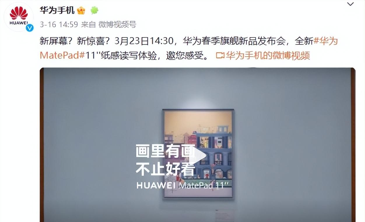 而根据华为官方对MatePad 11 2023 款平板电脑的预热显示,新款平板电脑将会主打纸感体验,为华为首款柔光屏平板,防眩护眼,纸感读写。