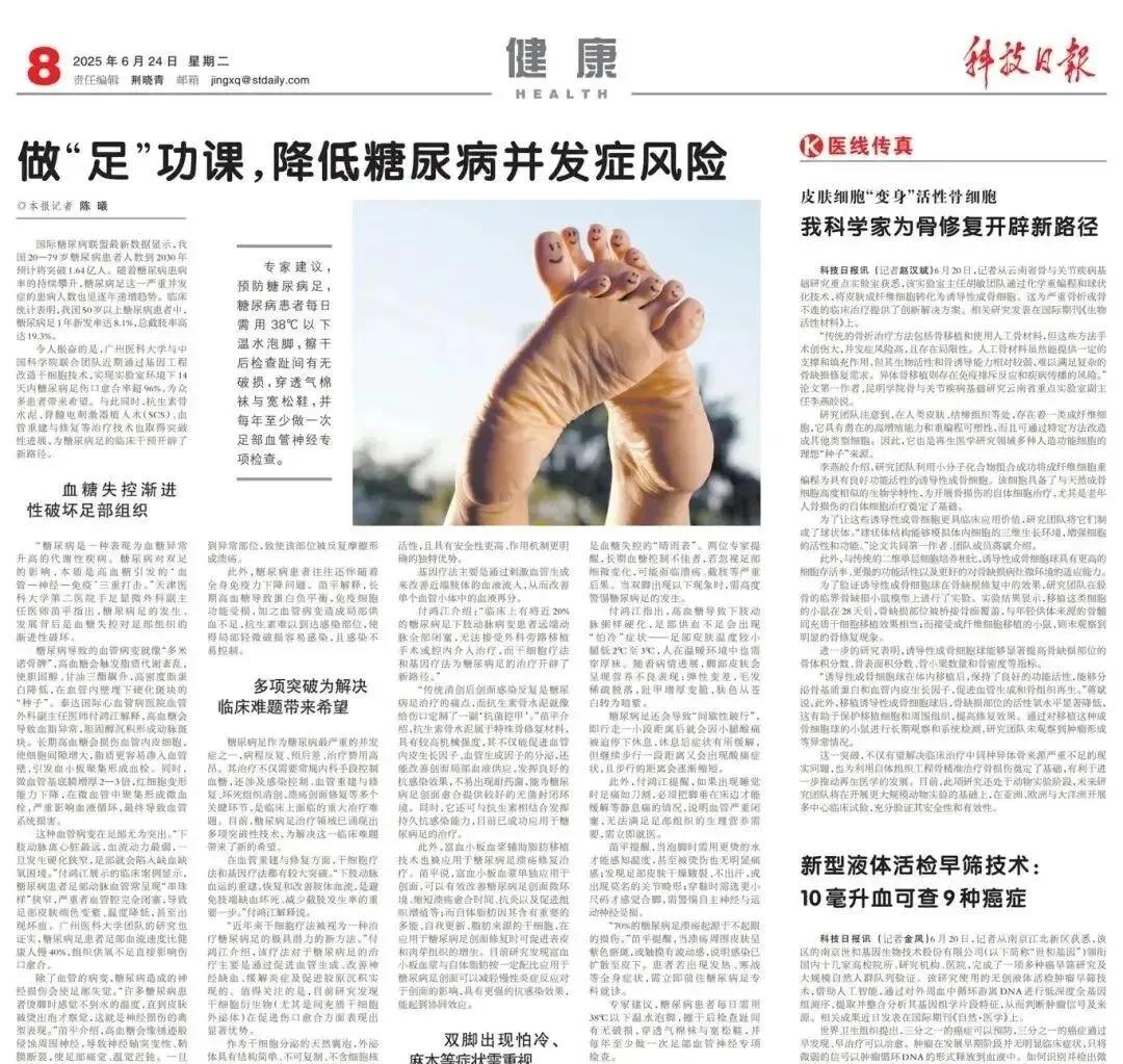 《科技日报》健康版头条以《做“足”功课,降低糖尿病并发症风险》为题,报道了广州医科大学与中国科学院联合团队的最新研究成果——基于基因工程改造的干细胞技术,在实验室条件下实现了糖尿病足溃疡创面14天愈合率超96%的突破性进展。该成果为糖尿病足的临床治疗提供了创新性策略。