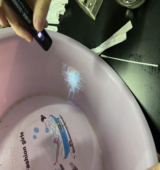 为解决这一教学难题,公共卫生实验中心教学团队经过反复实验,研发出荧光示踪实训方案。实训中,学生使用0.1%荧光粉水溶液作为采样液,对毛巾、口杯、浴盆等七类公共用品进行规范采样。操作结束后,通过便携式紫外光照射,采样区域的覆盖范围、均匀程度以及是否误触污染区等问题一目了然。