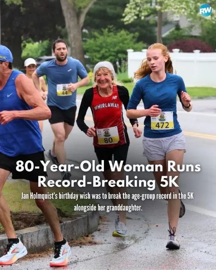 在马萨诸塞州的 Great Bear Run 5km比赛上,一位刚过完80岁生日的奶奶Jan Holmquist刷新了80岁年龄组的5公里纪录,用时24分08秒,平均配速4分49秒。