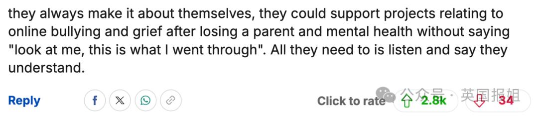“他们总是把自己凌驾于所有事情之上,明明不用非要强调‘看看我吧,我经历了那么多’的方式去支持那些关于网暴、失去家长和心理健康的的慈善活动。他们需要做的无非就是倾听和表示他们理解(别人的困境)。”