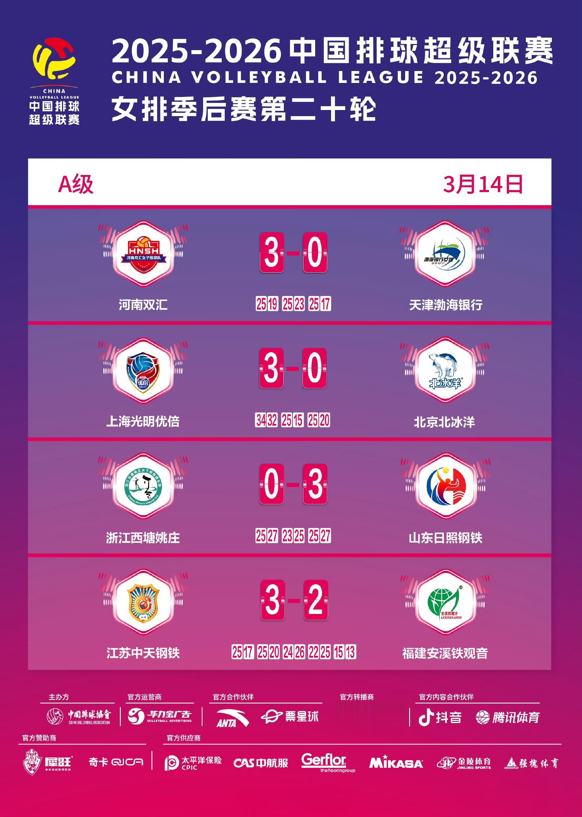 2025-2026中国女排超级联赛A级季后赛C组第20轮,河南双汇女排主场直落三局3-0(25-19 25-23 25-17)横扫天津渤海银行女排,河南女排2胜4负积6分结束季后赛,将战5-8名半决赛,天津女排3胜3负积10分晋级1-4名半决赛。