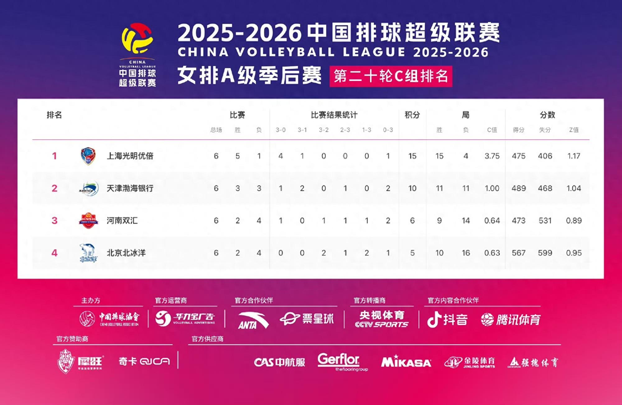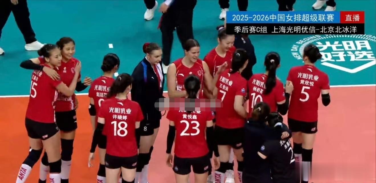 2025-2026中国女排超级联赛A级季后赛第20轮,上海光明优倍女排主场3-0(34-32 25-15 25-20)战胜北京北冰洋女排,上海女排5胜1负积15分小组第一晋级四强,北京女排2胜4负积5分排名小组垫底,将战5-8名半决赛。