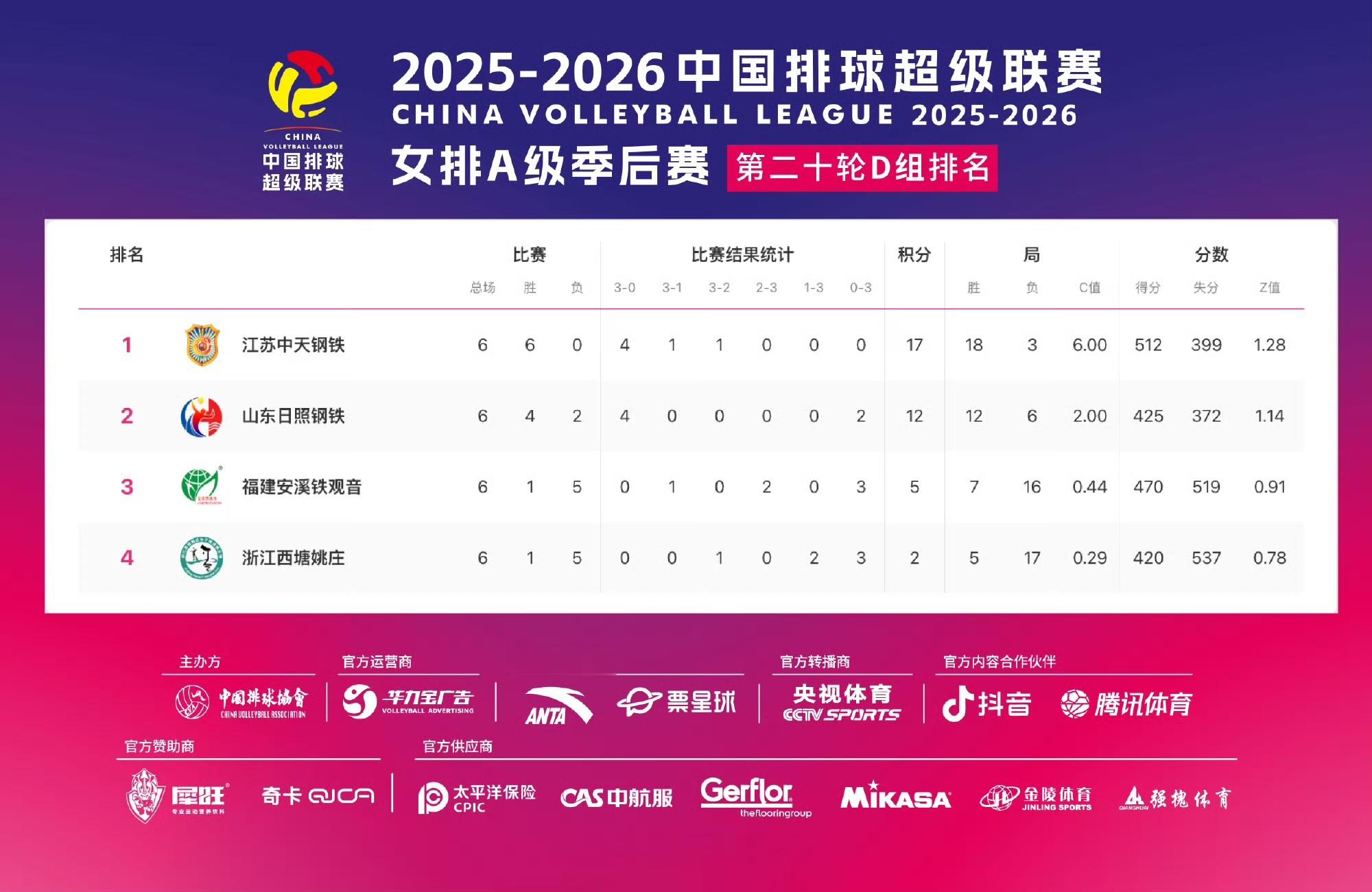 2025-2026中国女排超级联赛A积季后赛D组第20轮,山东日照钢铁女排客场3-0(27-25 25-23 27-25)战胜浙江西塘姚庄女排,山东女排4胜2负积12分小组第二晋级四强,浙江西塘姚庄女排1胜5负积2分排名垫底将战5-8名半决赛。