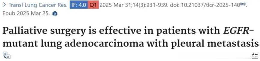 无独有偶,2025年3月,发表在Translational Lung Cancer Research《肺癌转化杂志》上的研究数据也显示,即便发生胸膜转移,在靶向治疗有效的前提下,开展手术依然可以帮助患者实现更好的肿瘤控制,将原本只有11个月的药物有效时间延长至46个月。