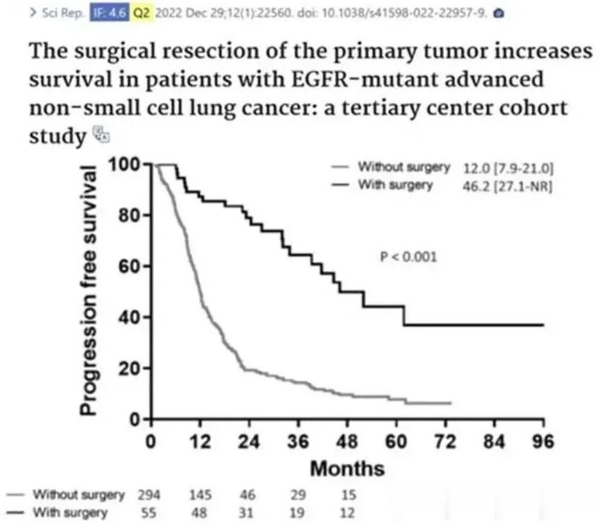 比如,2022年12月,发表在Scientific Reports《科学报告》上的一项研究中,来自中国台湾的医疗团队筛选了349名的EGFR突变的晚期肺癌患者,其中的55名患者在靶向治疗有效的前提下,针对残存病灶进行了姑息性的外科手术。