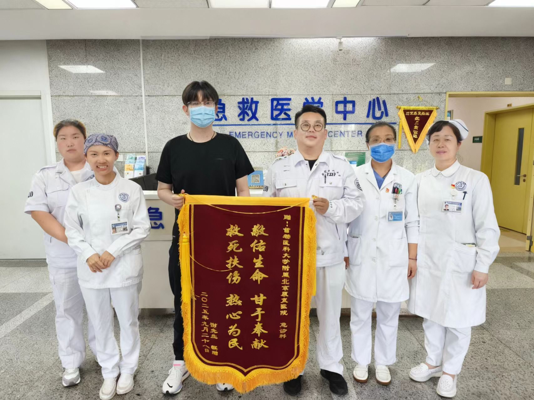 经过及时救治,伤者已完全脱离生命危险,身体正稳步康复。为了表达这份沉甸甸的感激,家属特意将一面印着“救死扶伤,热心为民,敬佑生命,甘于奉献”的锦旗送到苹果园急救站。鲜红的旗帜上,金色的字迹熠熠生辉,这不仅是对王坤车组救援行动的肯定,更是对所有急救人员默默付出的致敬。