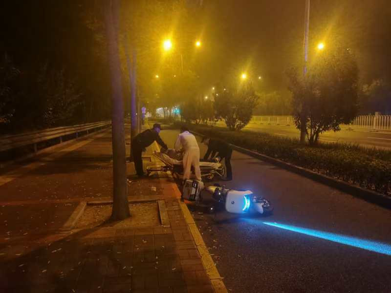2025年9月28日凌晨,刚完成一场急救任务的苹果园急救站王坤车组,正行驶在返程途中。突然,医护人员的目光被对侧马路的异常点亮所吸引。经观察,在漆黑的夜幕里,一辆翻倒的电动车车灯格外刺眼,车灯旁,一道身影倒在地上,情况不明。