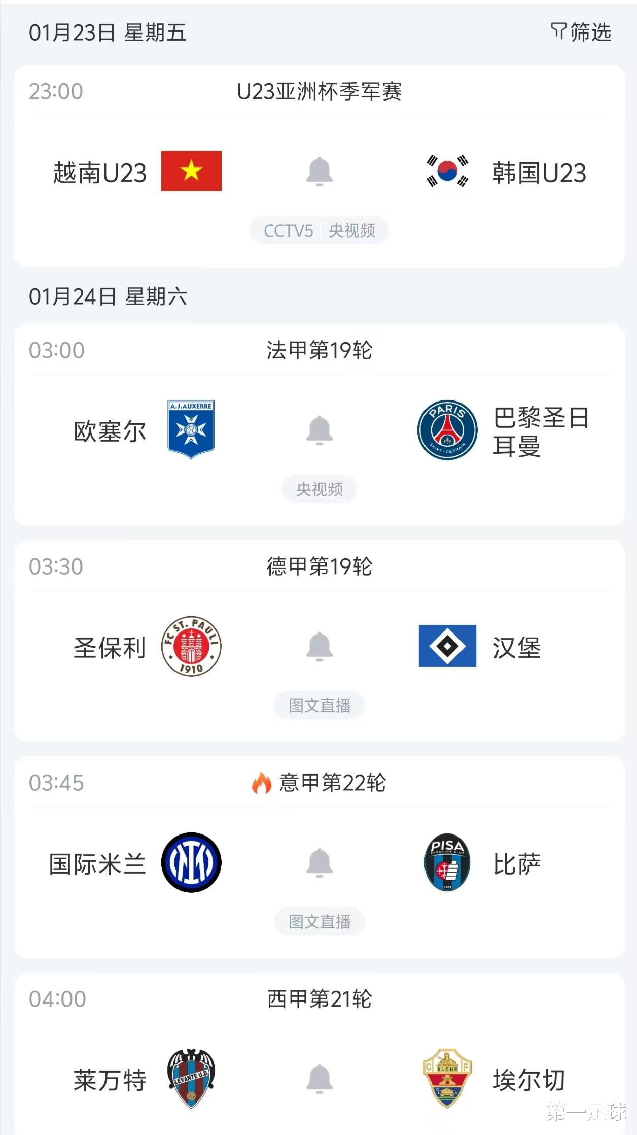 前几天,欧冠和欧联杯比赛,纷至沓来,对球迷来说,是喜忧参半的,因为欧冠和欧联杯的比赛,由于各队重视程度不一,实在是太难预测了。今晚,有U23亚洲杯季军战,另外欧洲五大联赛也有4场,我们来重点看看这5场比赛。