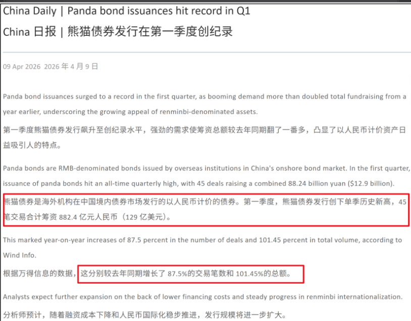 其实这背后是有逻辑的,不光是股市强,一季度我们的熊猫债发行,也创下单季历史新高: