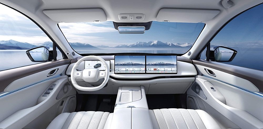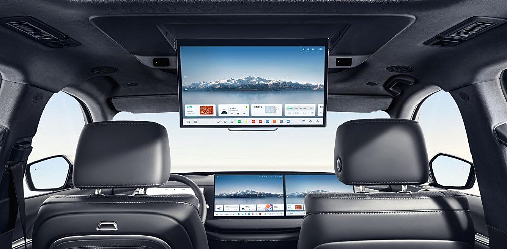 进入内饰,蓝山提供棕米、黑橙等配色方案,并大量使用Nappa真皮材质包裹。12.3英寸全液晶仪表、双15.6英寸2.5K分辨率中控与副驾娱乐屏以及29英寸超大尺寸HUD抬头显示组成四屏交互系统,同时还全系标配副驾零重力座椅、后排电动调节加热座椅及车载冰箱等配置。