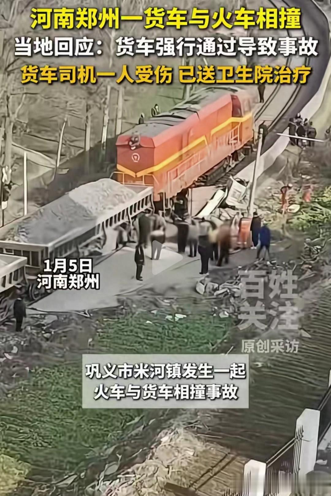 1月5日中午11点45分左右,河南郑州巩义市米河镇一条公路与铁路交叉路口,一辆货车与火车发生了猛烈的碰撞,只听到轰隆隆的一阵巨响后,货车被火车撞得侧翻了,货车里面的物品散落一地!