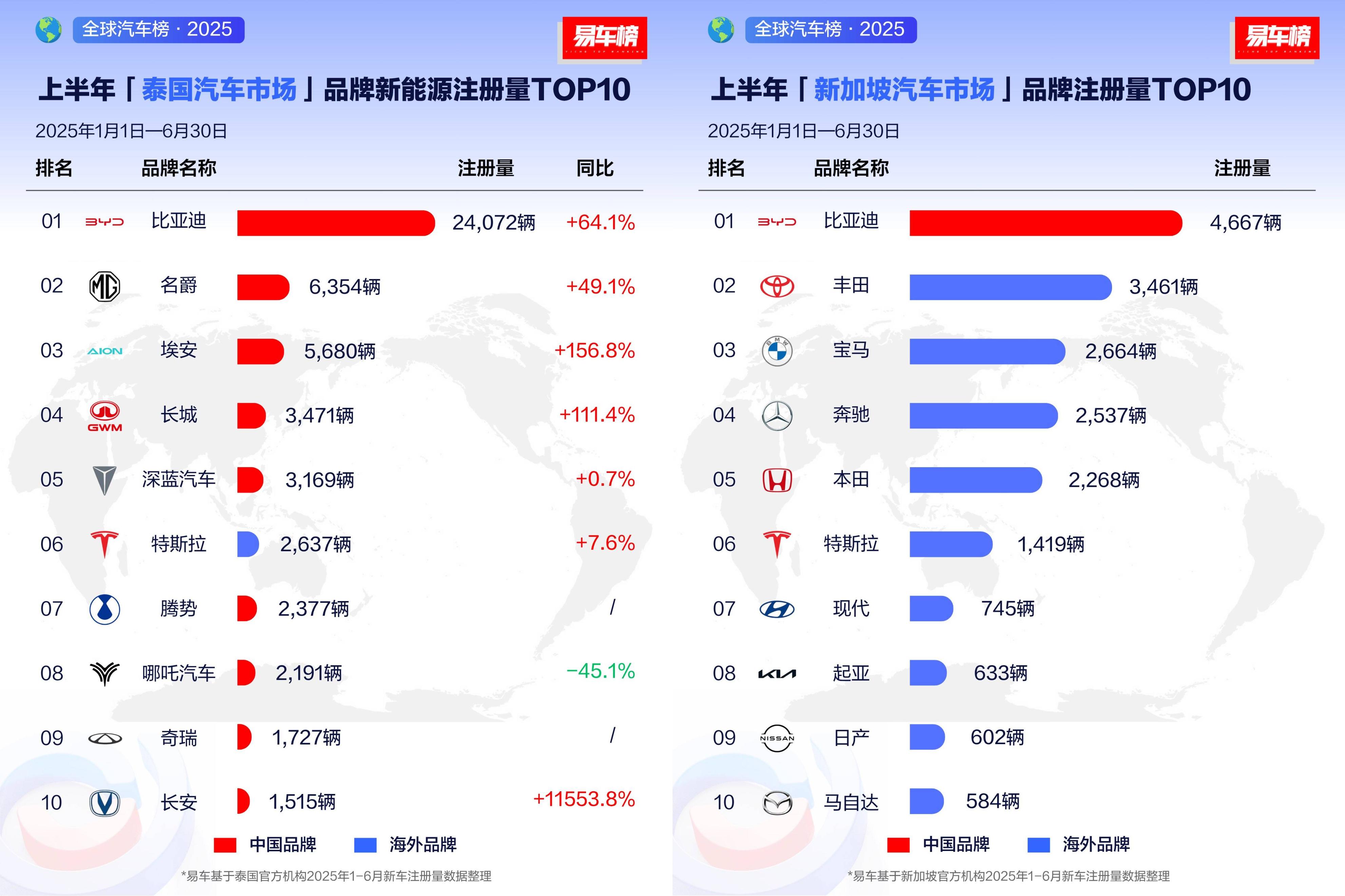 下面表格显示了2025年上半年比亚迪乘用车出口目的地前十国家及销量情况:
