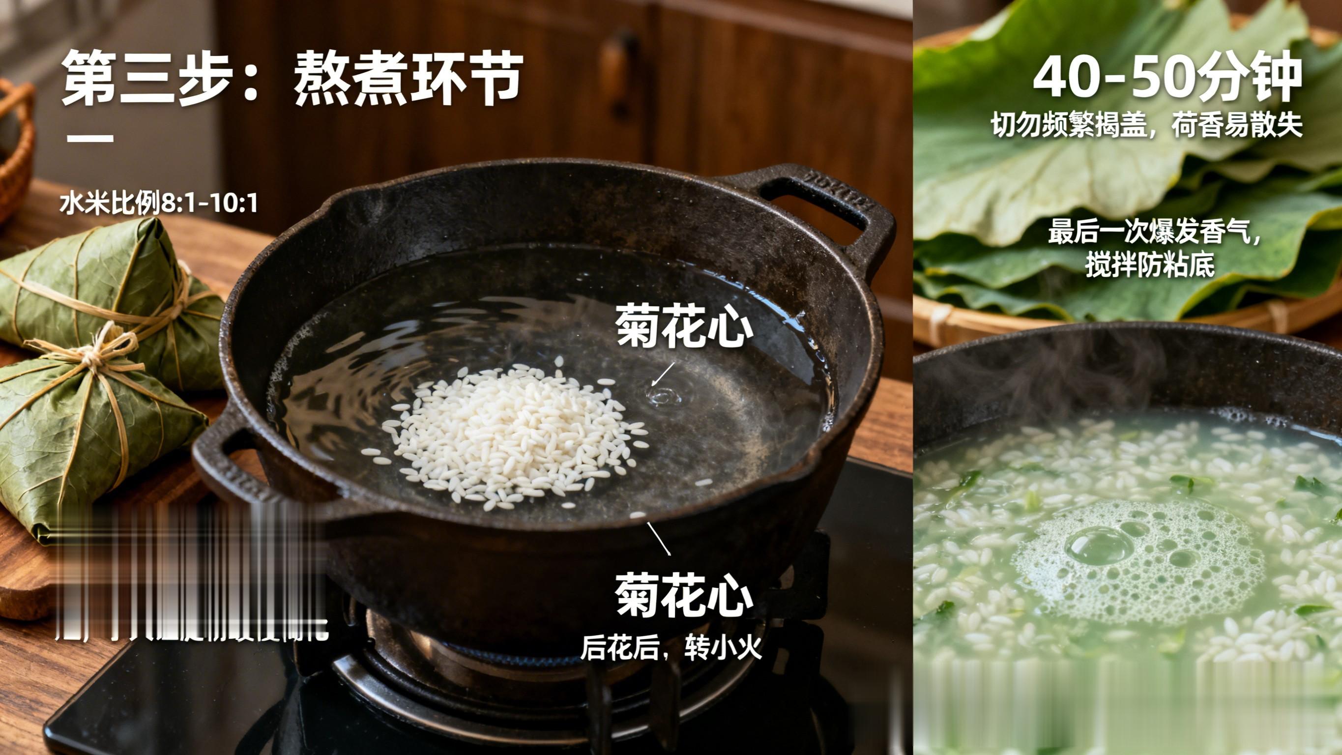 制作过程的核心在于“浸、包、熬”三个环节的精细操作。第一步为浸米。将大米淘洗两遍即可,切忌过度搓洗导致营养流失,随后用清水浸泡三十分钟至一小时。这一步至关重要,充分吸水的米粒在加热时能迅速破裂释放淀粉,缩短熬煮时间,使粥体更加绵密。第二步是荷叶的处理与包裹。若是新鲜荷叶,需用温水轻拭,剪去粗硬的叶脉边缘,切成适当大小的方块;若是干荷叶,则需提前用温水泡发三十分钟,使其恢复柔韧。传统的专业做法并非直接将荷叶撕碎入锅,而是采用“荷叶包米法”或“荷叶垫底法”。前者是将浸泡好的大米沥干,用荷叶紧紧包裹成粽状,再行熬煮,此法能让荷香由外向内层层渗透,米粒饱吸香气且形态完整;后者则是将大片荷叶铺于锅底或覆盖于米面之上,适合家庭快速制作。从风味融合的角度看,包裹法虽工序稍繁,但成品荷香更为内敛醇厚,且能有效避免荷叶中的单宁酸过量析出导致粥味发涩。