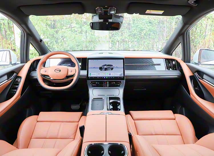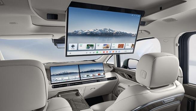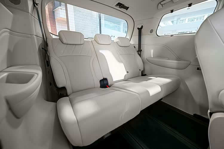 车内2+2+2的6座布局,配备30英寸一体式双联屏,内置8155芯片,还有HUD抬头显示、双侧电动侧滑门、7个安全气囊BOSE品牌音响、二排云感礼宾座椅,并配备后排小桌板、15.6英寸后排娱乐屏、4.3L车载冰箱等。搭载了eCruise Pro智驾,内置Mobileye EyeQ4芯片,无激光雷达。