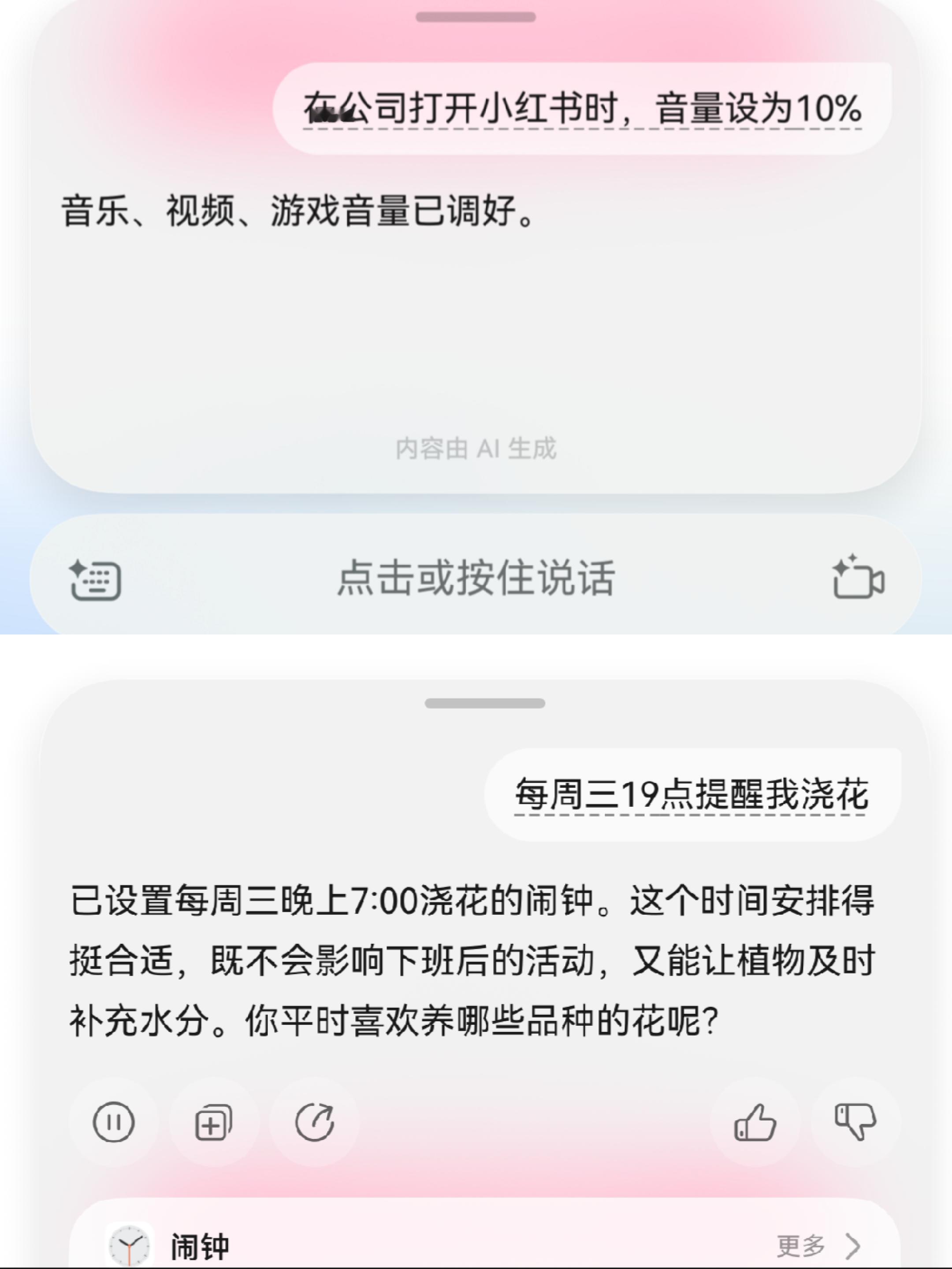 更值得称道的是其自动化任务能力,只需用自然语言下达指令,小艺就能精准执行定时或循环任务。比如“在公司打开小红书时音量设为10%”、“每周三19点提醒我浇花”这类个性化需求,都能一句话吩咐小艺设置完成。对于经常忘记琐事的用户来说,这一功能真的非常贴心,真正实现“事事有交代,件件有回应”。