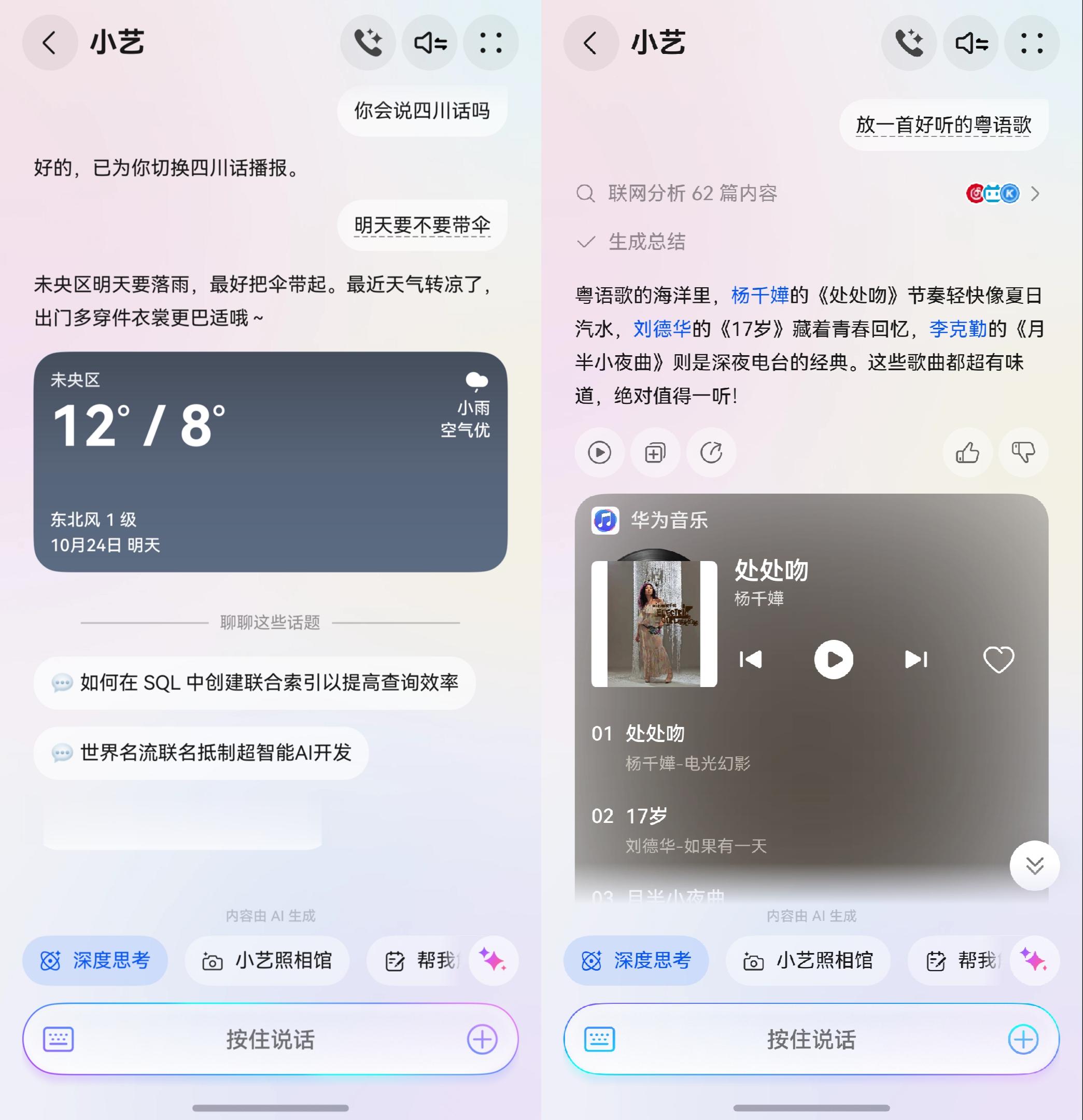首先聊聊小艺的方言对话升级,目前小艺已支持四川话、粤语、上海话等多种方言的精准识别与回应,不仅能听懂用户的方言指令,还能用地道方言回复,甚至对话框文字都会同步显示为用户对应使用的方言,人机交流也可以很亲切。比如用四川话对小艺说:明天要不要带伞?小艺会用四川话语音回复,文字也会同步成方言表述,其中的“带起、巴适”这些词非常符合方言习惯表达;或者用粤语问:放一首好听的粤语歌,小艺就会用粤语进行回应,并联动华为音乐开始播放。可以看到,这一功能对长辈群体极度友好,实现智能服务的“无门槛适配”。我们的爷爷奶奶也能轻松用乡音查询天气、播放想听的歌曲,主打一个方便!