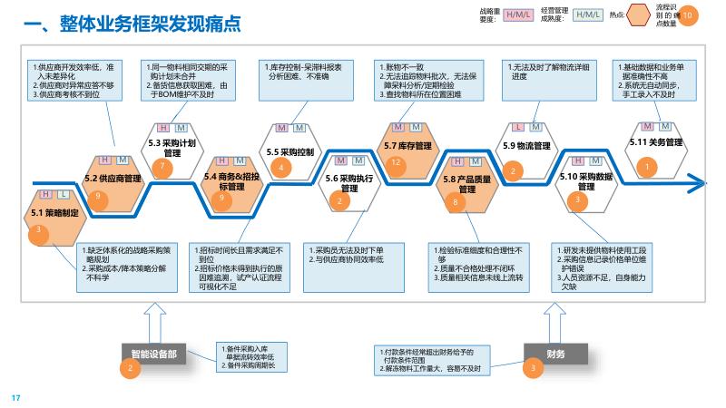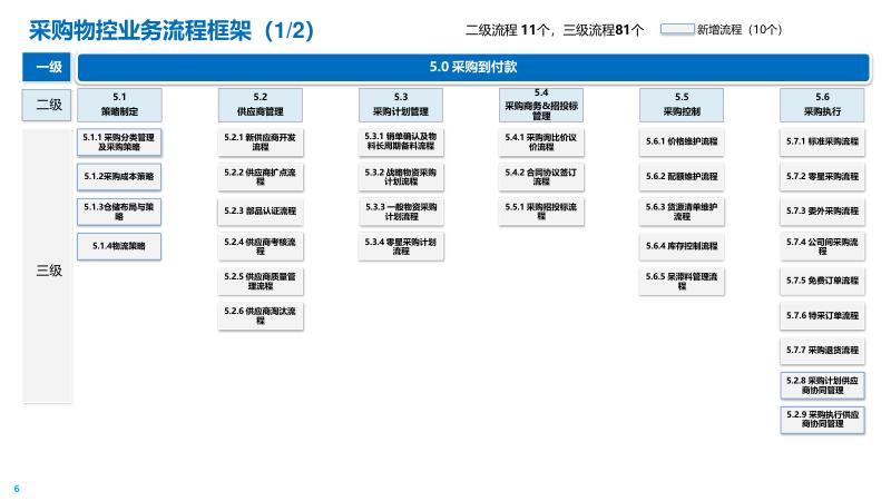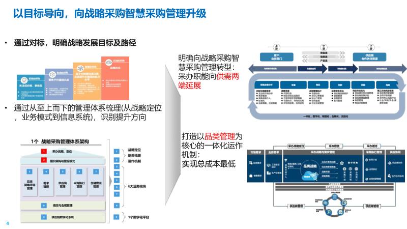 明确采购发展目标:短期目标:实现“全面集成采购”,打通客户、内部及供应商的业务流,提升协同效率。长期目标:打造“智慧采购”,通过大数据和IT技术实现采购的可预测性和智能化,全面提升价值链能力。业务流程体系设计:构建涵盖采购计划管理、采购商务与招投标管理、采购执行、库存管理、产品质量管理、物流管理及关务管理的全面流程框架。细化三级流程,如采购比价议价流程、合同协议签订流程、标准采购流程等,确保流程的完整性和可操作性。业务能力提升:通过聚焦用户体验的需求调研,识别关键干系人的需求和痛点,制定针对性的改进措施。提升采购人员的专业能力,加强内部培训,确保流程的有效执行。二、供应链体系完善