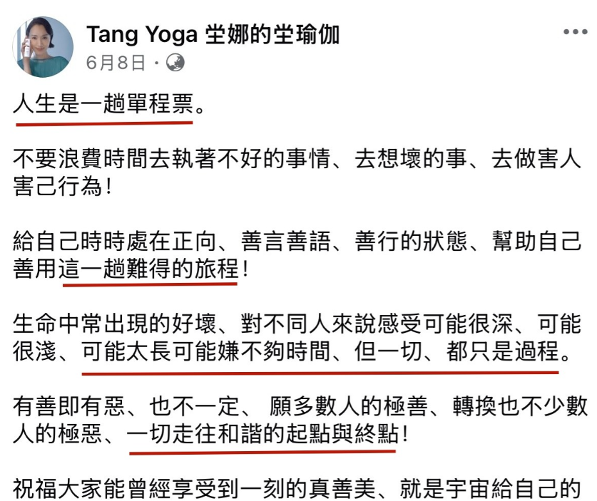 她在生前发布的最后一条动态中提到,“人生是一趟单程票”,可能生命不够时间,但一切都只是过程,都将走往和谐的起点与终点。