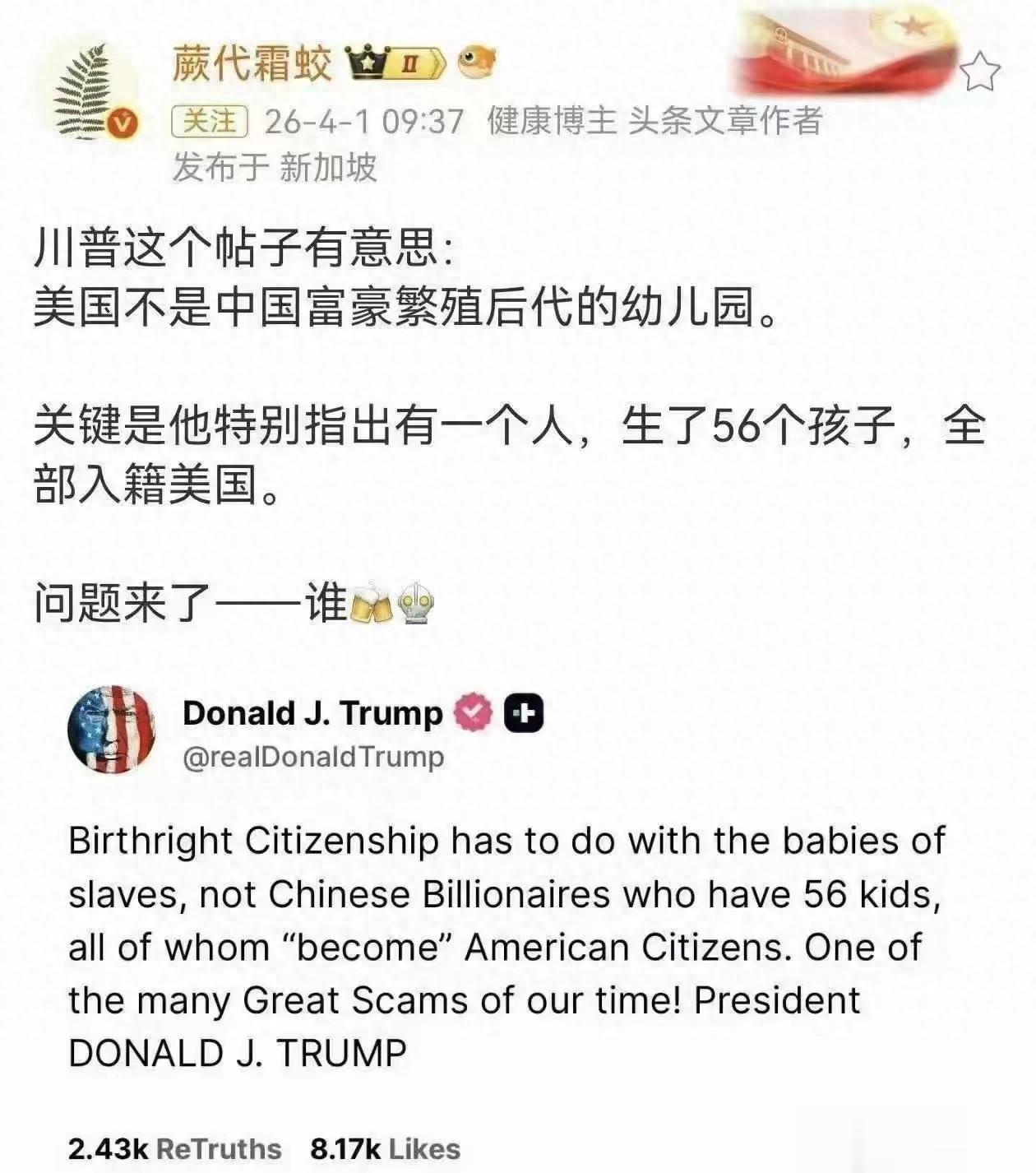 特朗普直接发文痛斥:“出生地公民权是给奴隶后代的,不是给有56个孩子、全入籍美国的中国亿万富豪的,这是我们这个时代最大的骗局之一!”纽约邮报更是造谣他在美国代孕100多个孩子,还想让孩子和马斯克子女联姻,把舆论彻底点燃。