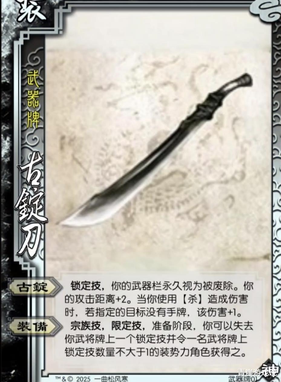 装备牌古锭刀,【古锭】效果是移除掉武器牌,获得古锭刀装备的全部效果。【装备】则是可以献祭自己的技能,让队友获得古锭刀的全部加成。如果说其他装备容易成为炮灰,那古锭刀则是辅助类卡牌,献祭自己令队友加成,谁的队友不希望获得永久的攻击距离呢?