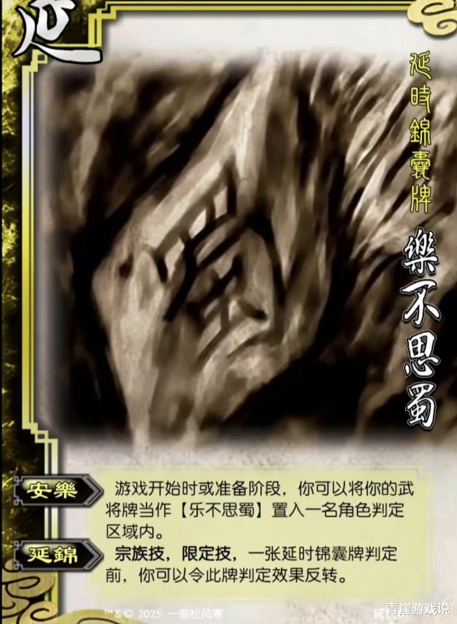 延时锦囊牌乐不思蜀,【安乐】能让其他角色贴上乐不思蜀的效果,【延锦】则是将判定结果反转!作为最强延时锦囊,乐不思蜀的作用不言而喻,而如果是乐不思蜀武将牌,那献祭自己贴上的乐不思蜀一定会命中,逆转局势的最终杀器!