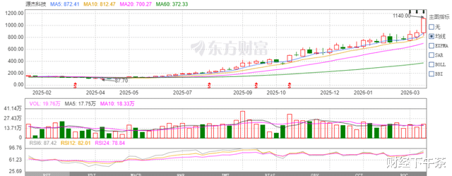 就在这一天,源杰科技开盘后迅速拉升,截至上午10点左右直冲20cm涨停,股价也来到了1140元,直接突破1000元和1100元两大整数关口。盘中有所开板,截至下午两点上涨17.76%,超过今天大跌的寒武纪,成为仅次于A股目前第二高价股,也是A股历史上第八只千元股!