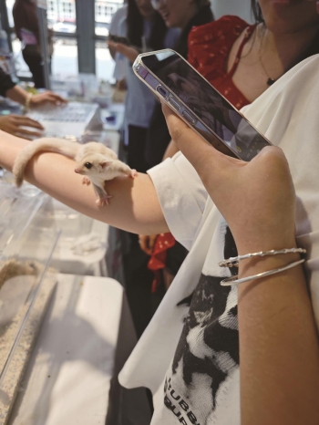 在异宠小宠互动区,导报记者看到鬃狮蜥趴在枯木上发呆,玉米蛇在盒子里肆意扭动,安哥拉兔和狐獴好奇地探着头,蜜袋鼯成了大家的“掌中宝”,观众里三层外三层,全举着手机拍照。