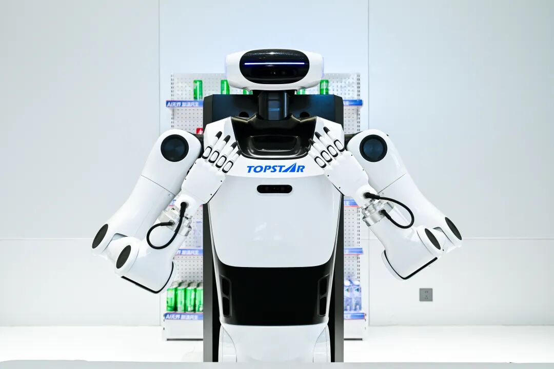 2025年9月,拓斯达发布了“拓星纪”系列轮式人形机器人。该机器人搭载智谱AI大模型,具备通过思维链进行复杂任务推理的能力。其仿生七自由度双臂,可灵活适配灵巧手、夹持器、吸盘等多种末端执行器,在仓储或工厂环境中能应对多种作业场景。