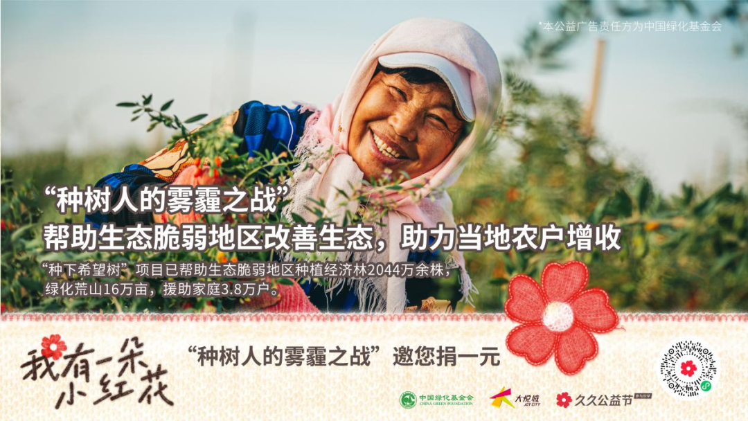 这份“生态旺”的底气,正通过公益力量传递给更多人。久久公益节期间,“种树人的雾霾之战”项目登上北京朝阳大悦城户外大屏,将西北枸杞地的丰收场景、生态变迁与农户增收的温暖故事搬上都市地标。大屏上,既有杞林连片的绿意,也有“枸杞人”丰收的笑脸,更清晰呼吁公众通过中国绿化基金会“种树人的雾霾之战”项目参与支持,让每一份小小的助力,都能为更多生态脆弱地区带去“荒漠变绿洲,丰收映笑颜”的希望。