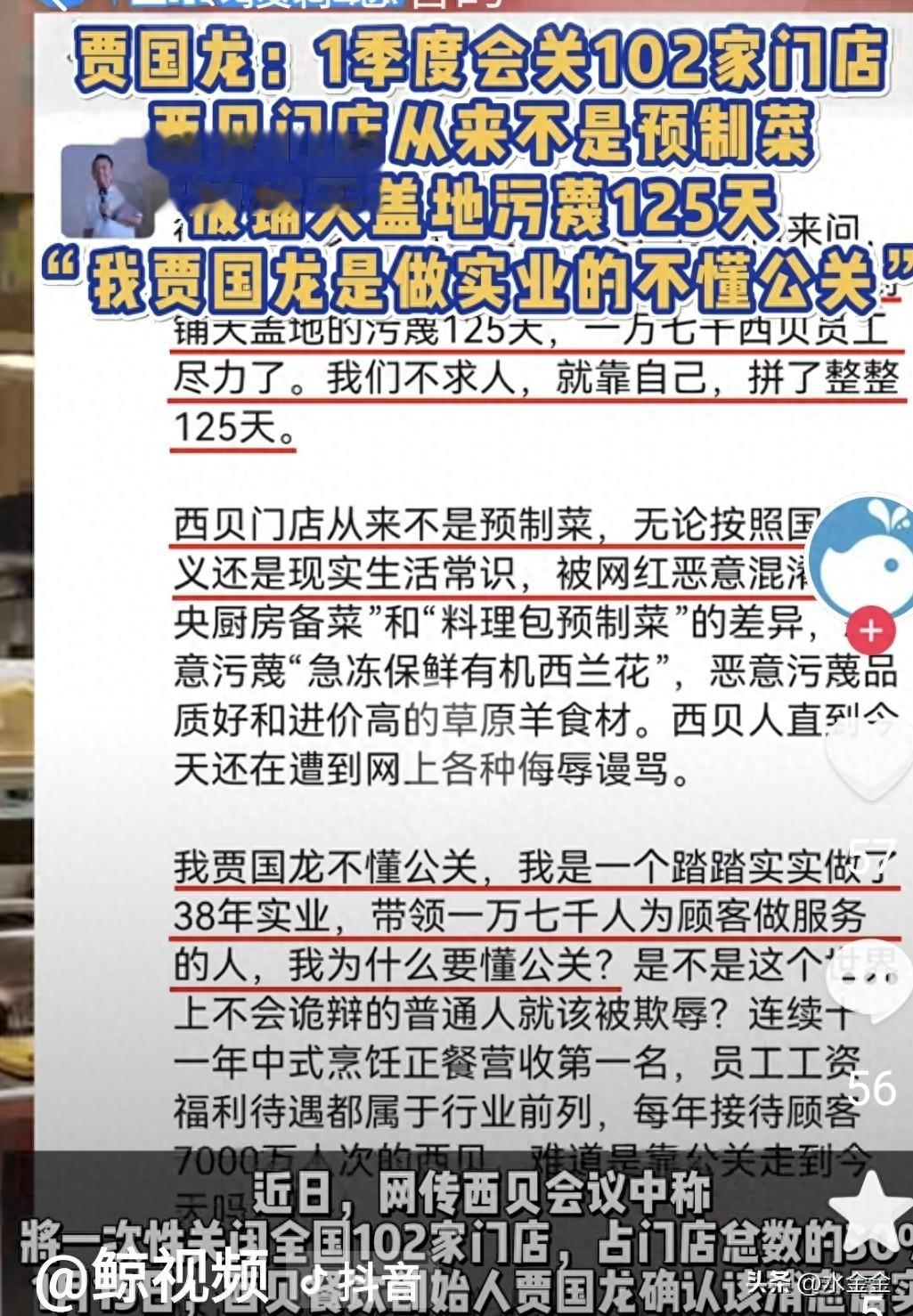 这两天西贝贾国龙,又发文了,说自己准备关店100多家。