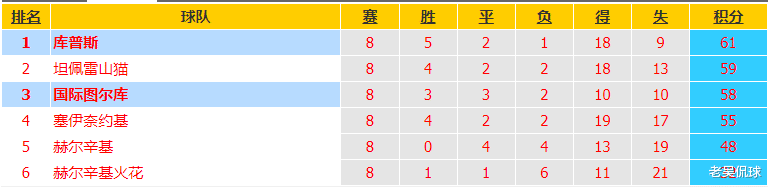 芬超冠军附加赛第9轮,古比斯七场不败,61分占据榜首,埃尔维斯连胜,落后2分紧随其后,图尔库国际连平58分排名第三,还有争冠的机会,塞伊奈约基两场不胜,55分基本很难追赶。赫尔辛基附加赛继续一胜难求,格尼斯坦32分垫底。