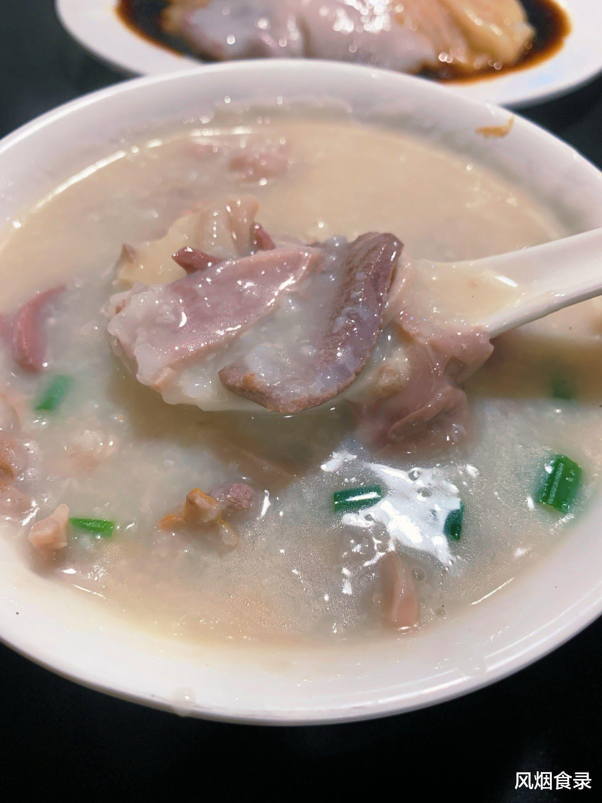 生鱼片、鱿鱼丝、海蜇丝、炸花生、油条碎,配一勺滚烫鸡鸭骨粥底,烫得食材脆滑鲜香,米粒开花不糜,入口绵滑如绸。