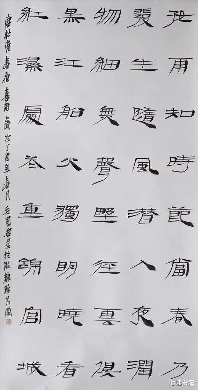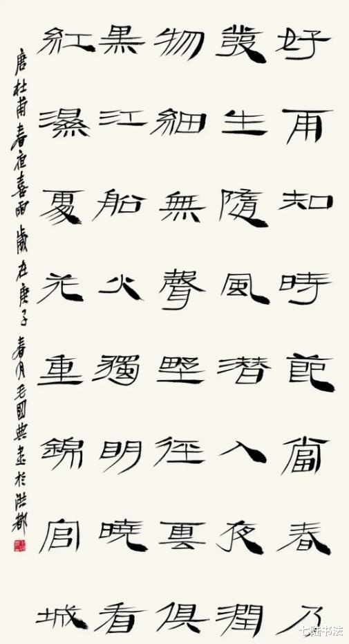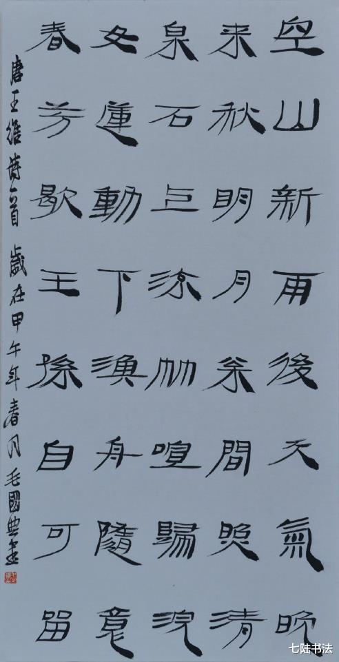 传统隶书作品的章法多整齐划一,字与字、行与行之间的间距均匀,给人以端庄、规整之感,而毛国典先生的作品则更注重疏密变化与节奏韵律,字与字之间有的紧密相连,有的疏朗开阔,行距间距灵活多变,如同舞者配合默契,整体呈现出一种自然流畅的“呼吸感”。