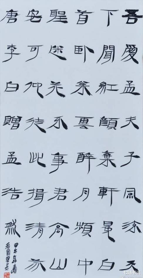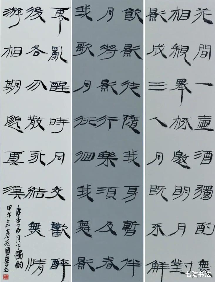 传统隶书的结构多对称均衡、端庄规整,字形多呈扁方形,给人以稳定、庄重之感,而毛国典则善于打破这种对称美,通过故意将字的结构写得左右或上下不均,在动态失衡中寻求新的和谐。